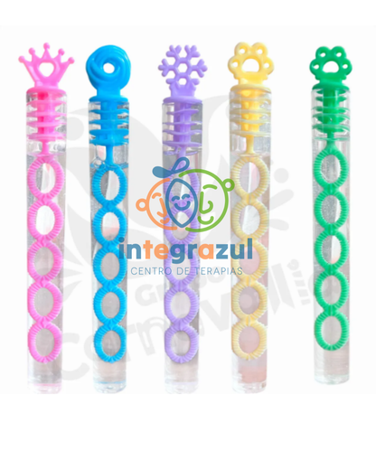 Tubos mini de burbujas (9 ml c/u) con varita integrada. Pack de 3 unidades en colores surtidos. Ideales para premios, cumpleaños, kits sensoriales y actividades al aire libre.