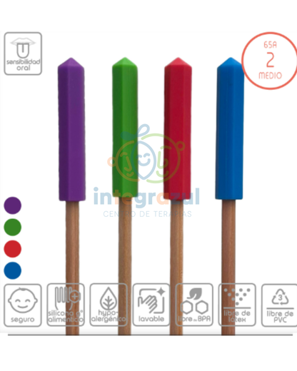 Mordedor de silicona grado alimenticio que se coloca sobre el lápiz para masticar de forma segura y silenciosa mientras se escribe o dibuja. Ideal para autorregulación oral, disminuir mordisqueo de ropa/útiles y aumentar atención en sala de clases o en casa.