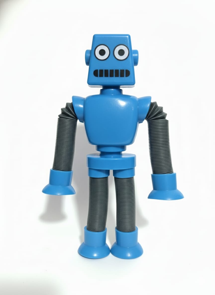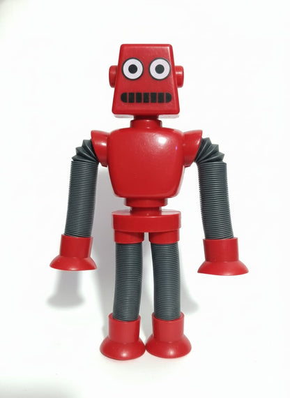 Mini robot antiestrés con brazos y piernas flexibles tipo tubo y ventosas en manos y pies para pegar en superficies lisas. Ideal para regular la ansiedad, mejorar el foco y trabajar motricidad fina mientras juegan.