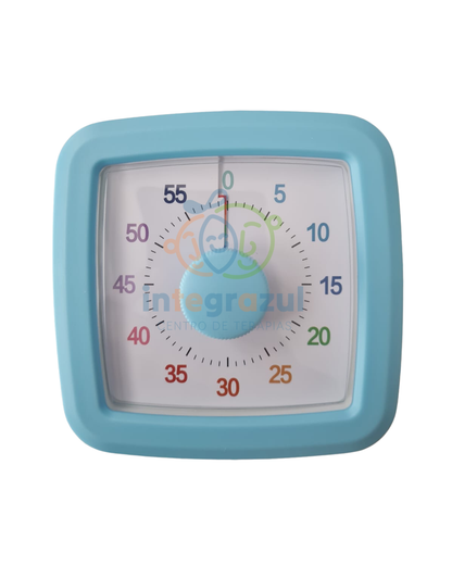 Temporizador visual de cuenta regresiva (0–60 min) con perilla de ajuste. Ayuda a organizar rutinas, manejar transiciones y a visualizar el tiempo restante en casa, aula y sesiones terapéuticas.